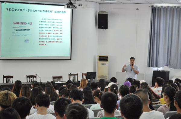 茅山校区党总支副书记汤波首先就“大学生文明行为养成教育”开展了专题讲座。讲座中,汤波副书记从“大学生文明行为养成教育”活动的主题、目标、安排等方面呼吁广大学生干部要在各班积极开展关于“文明行为”主题系列活动。