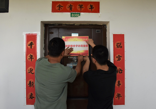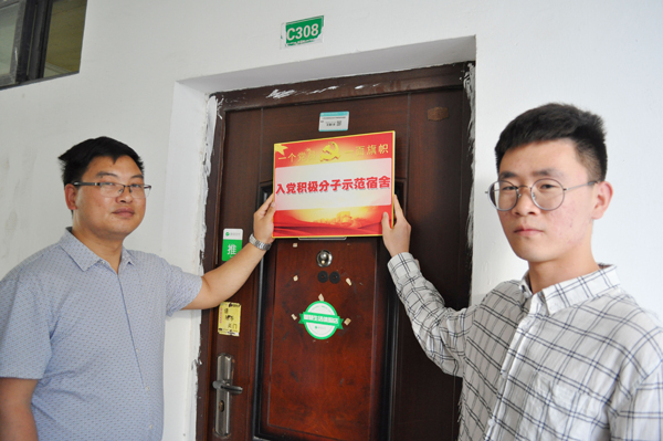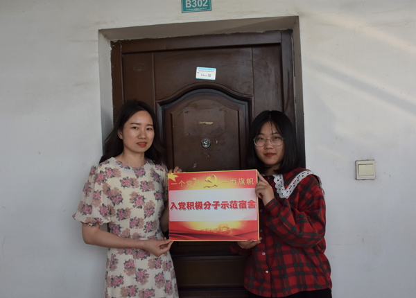 活动第二部分,校区学生党支部书记朱锦带领全体入党积极分子开展“亮身份、做表率、树形象——我是党员我先行”入党积极分子示范宿舍挂牌活动。会议上,入党积极分子代表向全体积极分子宣读了《入党积极分子示范宿舍建设承诺书》,并作出承诺。随后,党员教师带领积极分子到宿舍进行挂牌。此次挂牌活动更好地推进了“大学生文明行为养成教育”活动,通过“亮身份、做表率、树形象”,学生党员、入党积极分子发挥先锋模范带头作用,进一步加强了大学生宿舍文化建设,带领宿舍同学养成良好的文明行为,为和谐校园建设作出积极贡献。