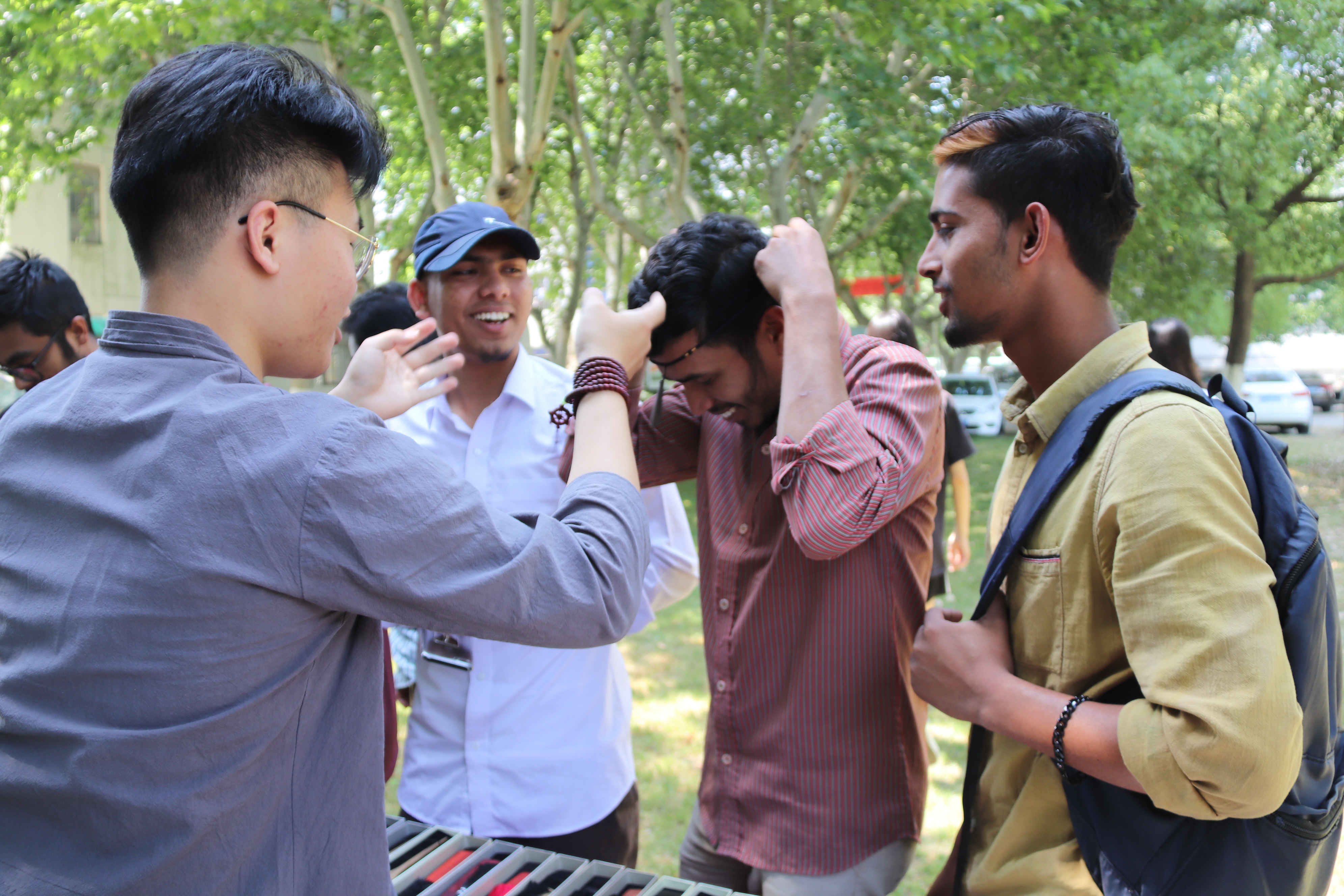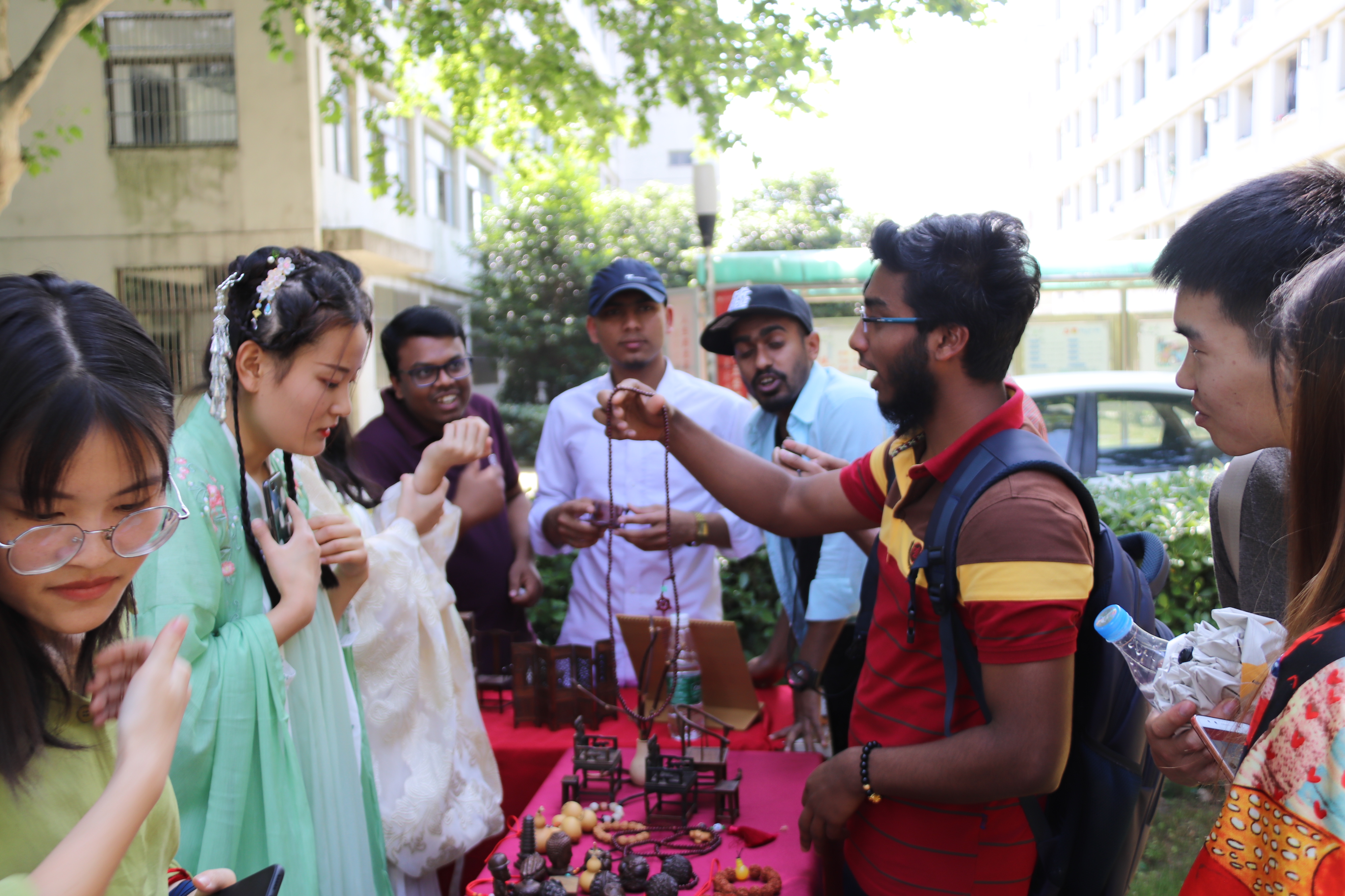 活动在中正式拉开帷幕,身着汉服的家具社团同学为留学生表演了《诗经》、《论语》等传统文化经典著作诵读,并展示了优秀红木手工制品:红木书签、发簪、手镯等。在设置的操作台上,留学生们跃跃欲试,在社团同学的帮助下完成了他们的手作首秀,对中国传统文化有了更加深入的了解。