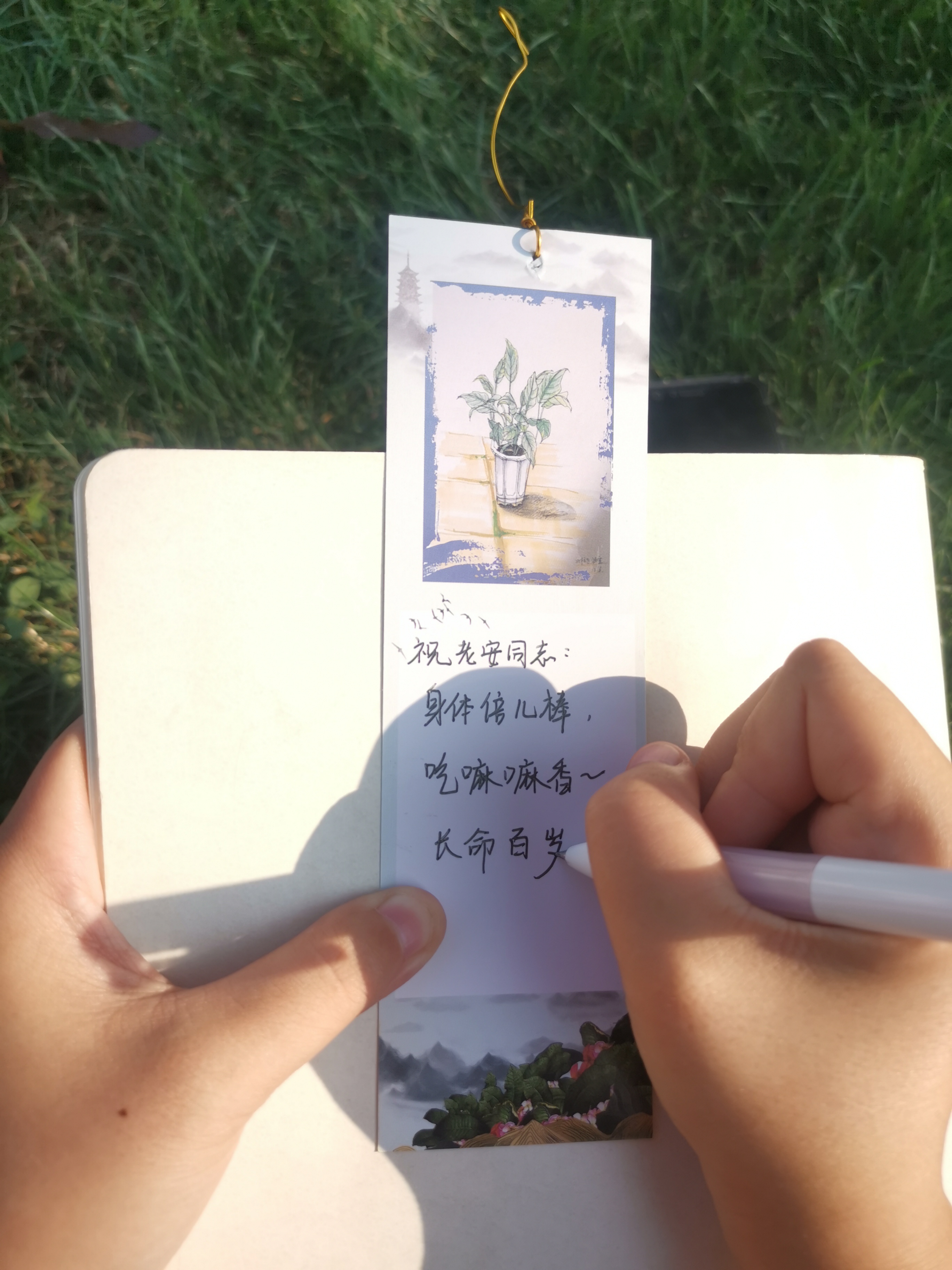 大家你一句我一句吐槽“亲爹”的日常关爱引起全场共鸣,五位同学朗诵了朱自清的《背影》,熟悉的段落让大家带回到孩提时代。全场合唱筷子兄弟的《父亲》,有心的同学录下了这首合唱发送给自己的父亲。学生们拿出自己的手机用红包表达出自己最直接的祝福,父亲们收下了红包同时表示了来自老父亲的欣慰,甚至有好几个父亲用回赠红包的方式表达了自己的开心,最后大家在我们同学用自己的手绘作品制成的书签上写下了对父亲的祝福并悬挂在雪松树下,阵阵清风习来,将祝福送到了父亲们的身边。