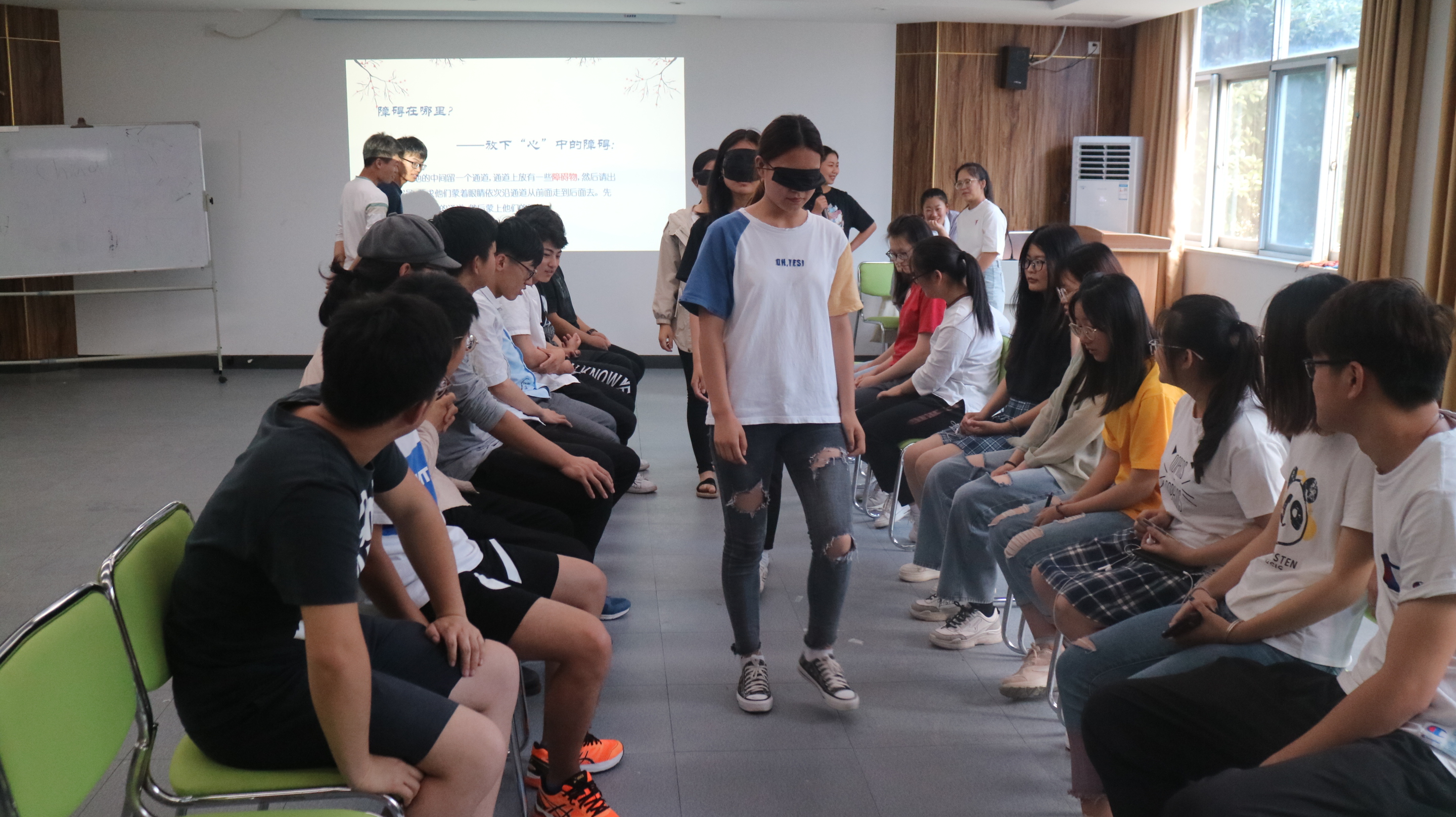 活动共分为“柳树摇”“桃花朵朵开”“障碍在哪里?”和“激励留言卡”四个环节。同学们先建立团队,彼此认识,沟通感情,活跃气氛,在“障碍在哪里”活动,大家相关交流分享。最后,大家书写了激励留言卡,寄托了同学们对彼此的祝福,让大家更有信心面对将来的障碍。