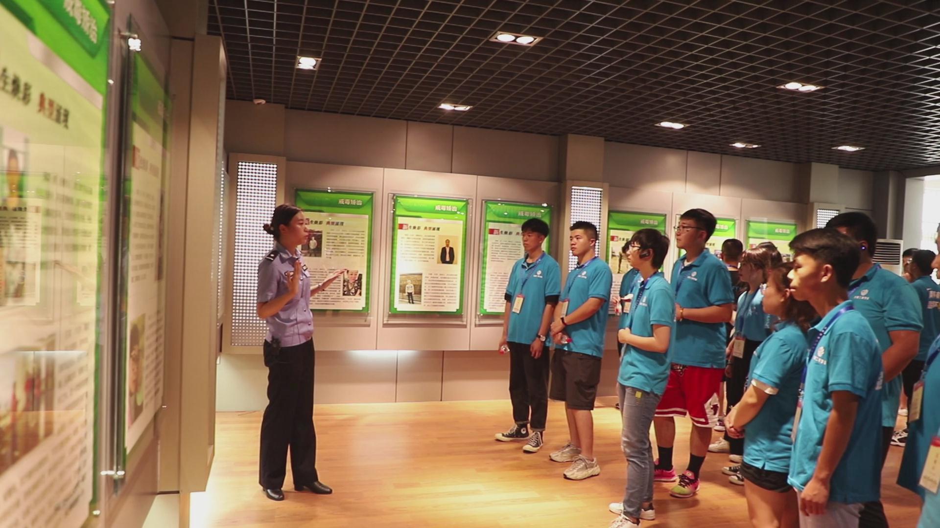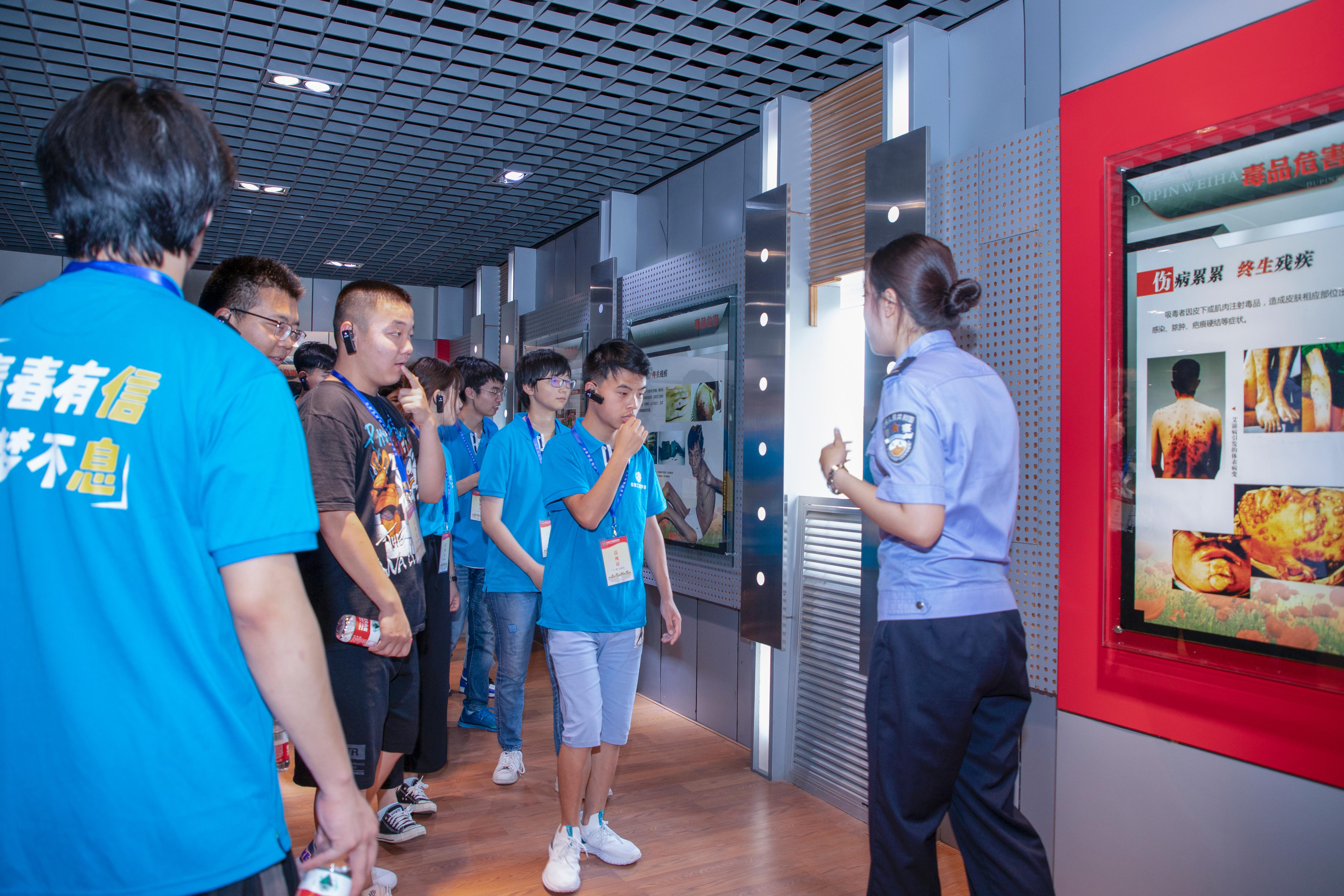 活动中,戒毒所民警带领同学们分别参观了戒毒人员劳动、生活、教育学习的场所,直观地了解戒毒人员的生活状况。随后,民警通过现场模拟演示等方式向同学们详细地讲解了各种各样的戒毒辅助手段。在互动体验区,同学们带上VR眼镜,在虚拟环境中观察毒品带来的危害。在教育展示馆,内容丰富多彩的图片、文字、模型和视频激发了学生们的学习热情,民警详细介绍了新型毒品的种类和禁毒相关政策法规,告诉同学们在平时生活中如何进行识别、防范、拒绝毒品。同学通过学习认识到毒品给社会带来的无尽灾难,深刻感受到毒品是人类社会共同的敌人。