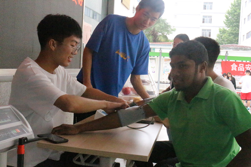 活动现场,在“食品安全知多少”环节,通过展板宣传、传单发放,趣味知识问答,让同学们关注身边的食品安全知识。同时,营养协会为同学们量身高、测体重、量血压,耐心地讲解膳食宝塔知识,普及食品营养安全知识,让同学们树立安全、科学、卫生的饮食习惯。除此以外,后勤管理与服务中心开为学生代表举办了“食堂开放日”,让学生近距离的了解食堂食品安全的操作流程和规范。