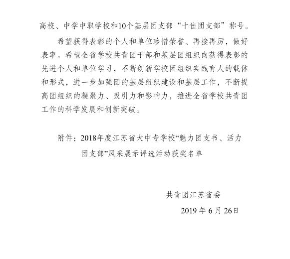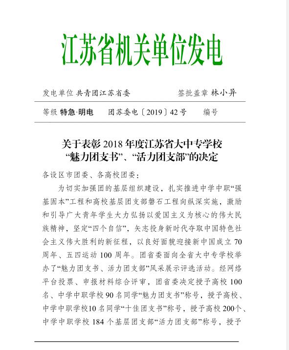 7月3日,共青团江苏省委公布了《关于表彰2018年度江苏省大中专学校“魅力团支书”、“活力团支部”的决定》。永利官网机电工程学院机电一体化专业2017年级金纬班团支部在此次评选活动中荣获“活力团支部”称号。