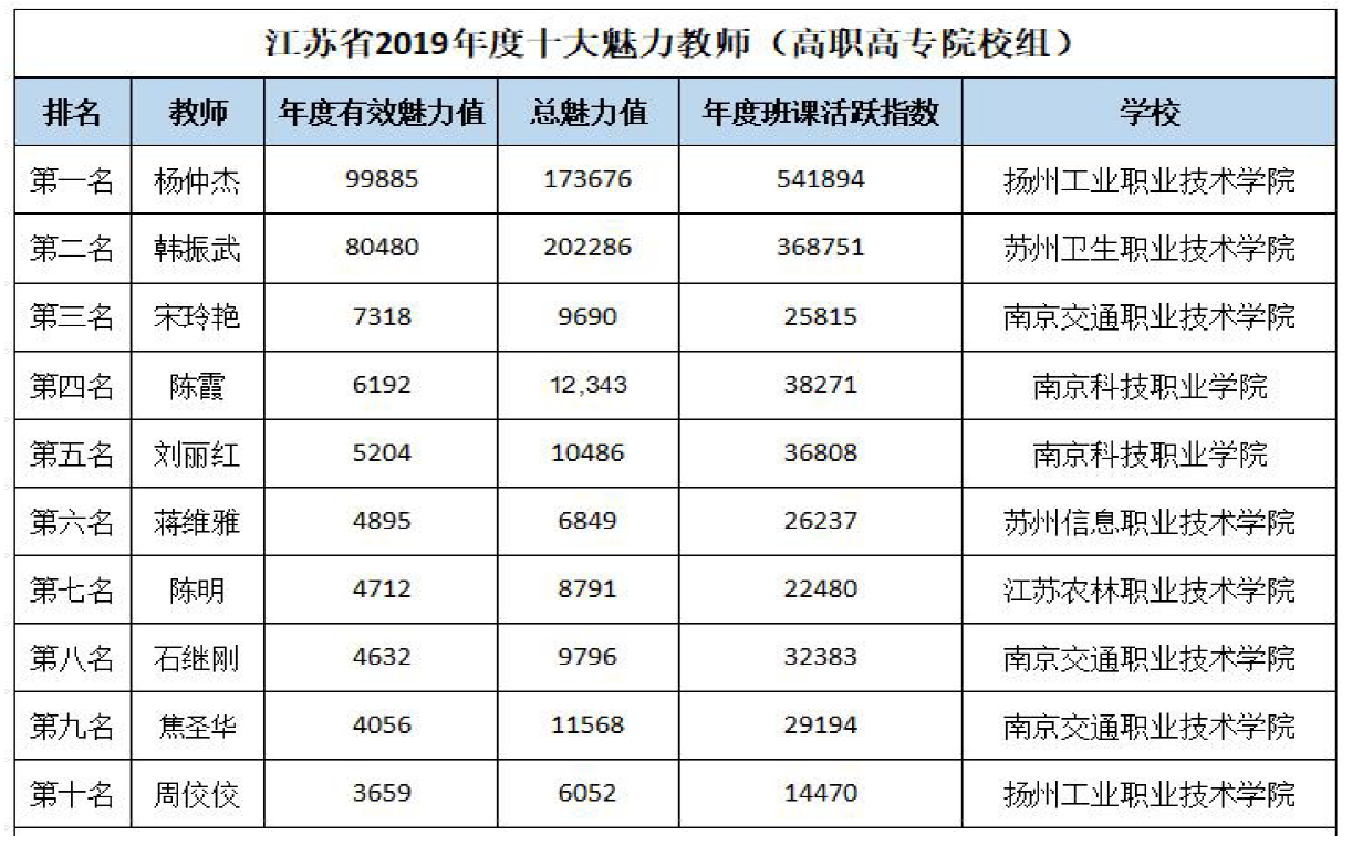 “江苏省2019年度十大魅力教师(高职高专院校组)”排名如下: