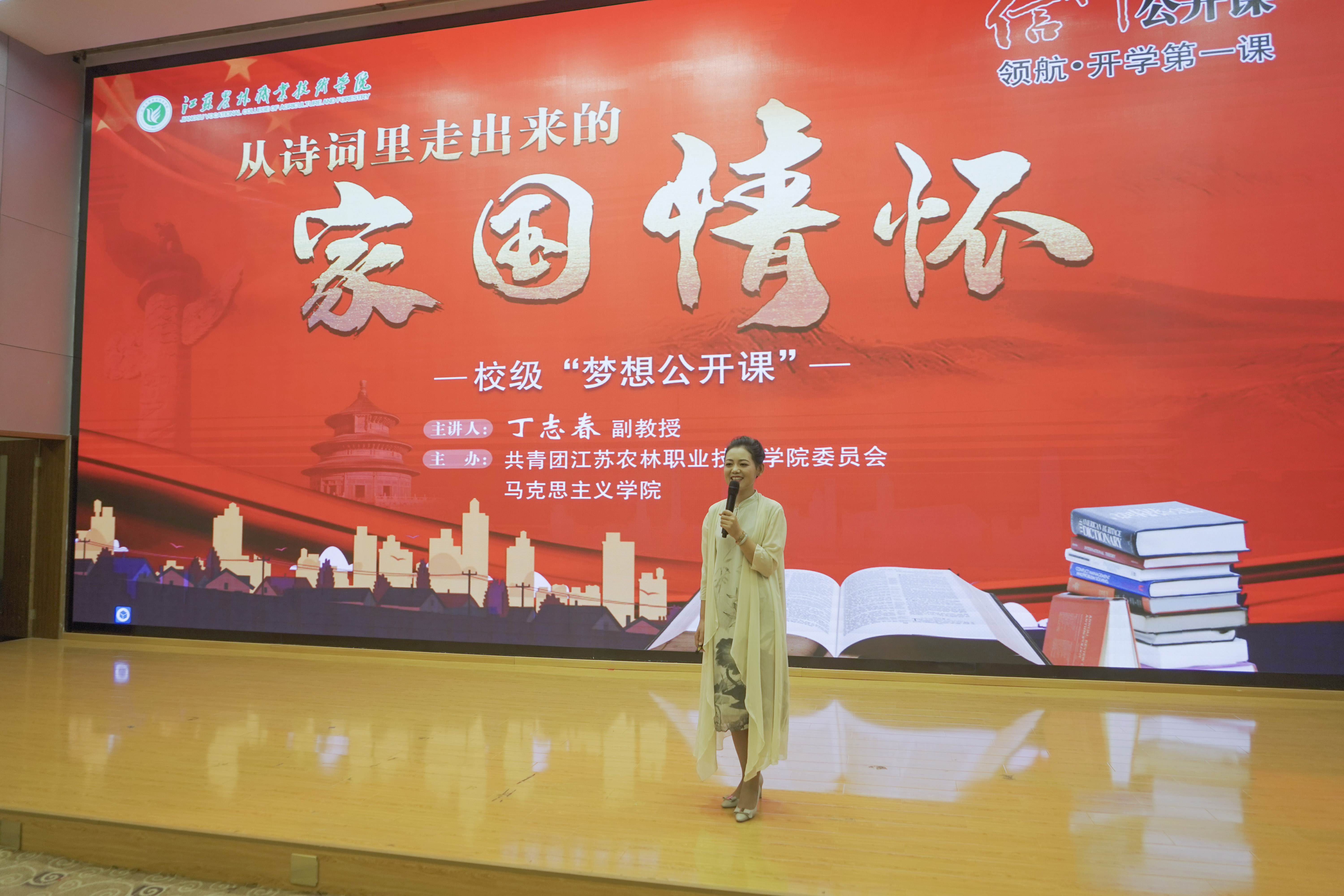 马克思主义学院丁志春副教授以“从诗词里走出来的家国情怀”为主题,为团员青年上了“开学第一课”。她以《诗经》中的《黍离》、《击鼓》为切入点,从屈原的爱国情怀讲到唐宋诗人们的爱国诗词,再到以毛泽东同志为代表的中国共产党人的革命诗词,她深入浅出的讲授了一首首气势磅礴的诗词和一段段诗词背后感人至深的故事,深层次的揭示了早已深入国人骨髓、融入文人的血液的家国情怀与时代责任。