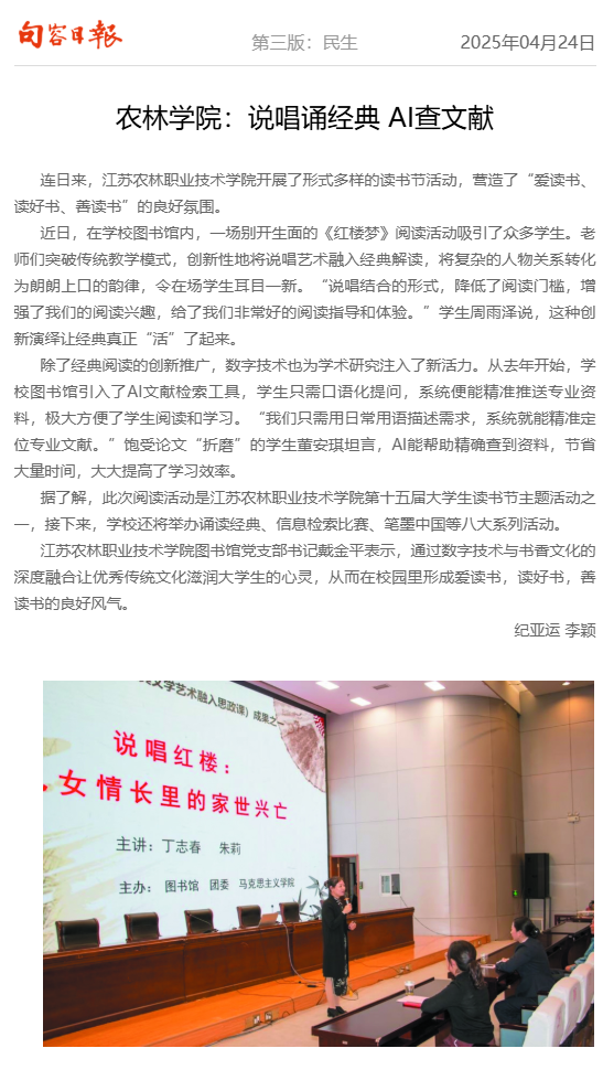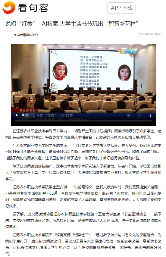 在第30个世界读书日期间,【句容电视台】【句容日报】等多家媒体报道永利官网图书馆开展“数智书香,阅见美好”为主题的第十五届大学生读书节活动。
