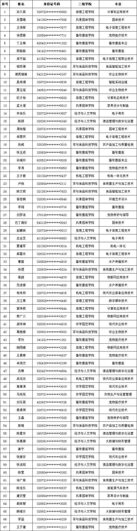 根据《省人力资源和社会保障厅、省教育厅、省财政厅关于做好求职创业补贴发放工作通知》(苏人社发〔2019〕198号)、《省人力资源和社会保障厅、省教育厅、省财政厅关于进一步明确求职创业补贴申领发放有关问题的通知》(苏人社函〔2021〕154号)要求,经本人申请,学生工作处初审,句容市人社局复审,拟定以下同学获得江苏省2026届毕业生求职创业补贴(第一批)发放资格,现予以公示。